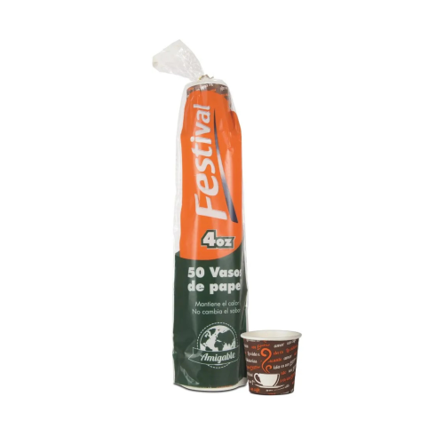 El Vaso Festival 4 onzas de cartón, paquete de 50 unidades, es una opción ideal para servir bebidas calientes como café, té o chocolate en eventos, oficinas o establecimientos comerciales.