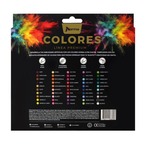 Caja de colores Norma Premium. Desarrolla tus habilidades artísticas con los colores norma ultra suaves fabricados con los mas altos estándares de calidad para que puedas expresar tu talento y creatividad sin limites. Disfruta de su mina ultra suave y tonos intensos.