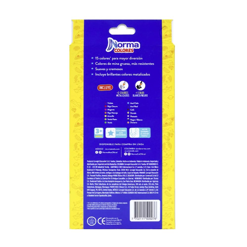 Caja de Colores 13+2 unidades, incluye dos colores metalizados, mina de 4mm súper resistente a golpes y caídas, no se quiebra al sacar punta con el sacapuntas.