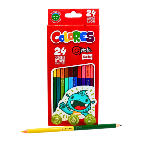 Los Colores Scribe Q'Nota Doble Punta 12/24 son un set de 12 lápices de colores que ofrecen 24 tonos diferentes gracias a su diseño de doble punta. Cada lápiz cuenta con una mina de 3 mm, proporcionando colores más intensos y una excelente suavidad y cobertura. Son ideales para actividades escolares, artísticas y de oficina.