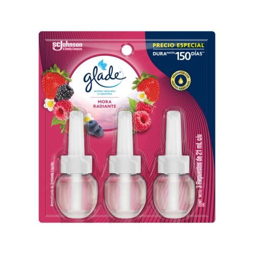 El Repuesto de Ambientador Glade Mora Radiante en Paquete de 3 es una opción ideal para mantener tus espacios con una fragancia fresca y agradable. Cada repuesto contiene 21 ml de aceite perfumado, diseñado para usarse con los dispositivos eléctricos Glade PlugIns.