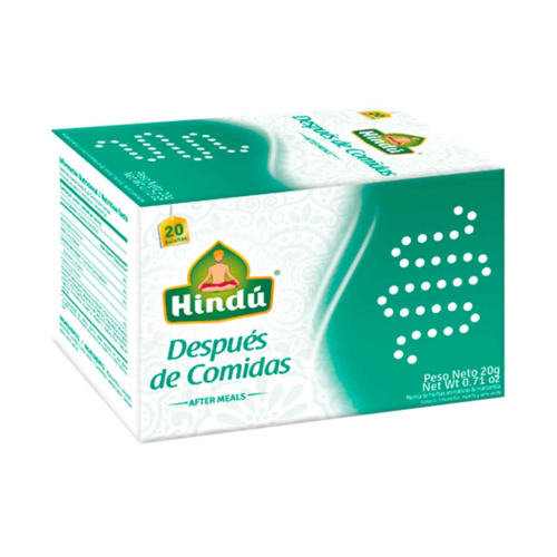 La "Aromática Hindú Después de Comidas X20" es una infusión especialmente formulada para apoyar la digestión tras las comidas. Esta mezcla combina hierbas como manzanilla, anís, toronjil, limoncillo y menta, conocidas por sus propiedades digestivas y relajantes.