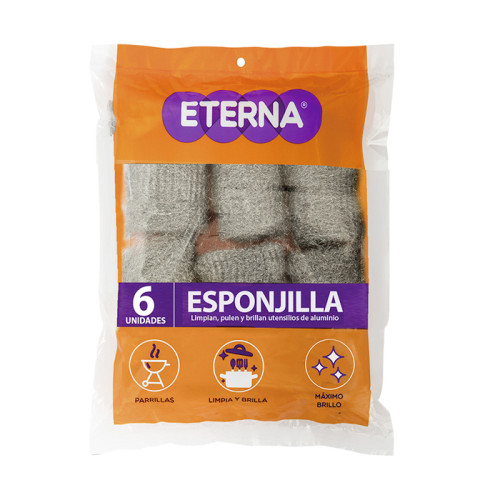 Las Esponjas de Brillo Eterna en presentación de 6 unidades son herramientas de limpieza diseñadas para facilitar la eliminación de suciedad y residuos en diversas superficies, especialmente en utensilios de cocina.