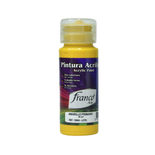 La Pintura Acrílica Franco Arte 60 ml en color Amarillo Primario es una pintura a base de agua, ideal para decorar, proteger o señalar materiales como madera, MDF, metal, yeso, cerámica, cartón, papel, entre otros. Ofrece un acabado liso y duradero, es no tóxica, lavable, de alto rendimiento, buen cubrimiento, fácil aplicación, excelente adherencia y resistencia a la abrasión.