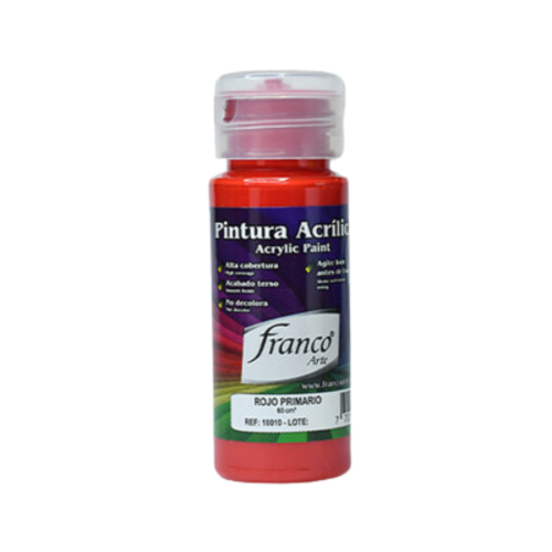 La pintura acrílica Franco Arte 60ml en rojo primario es una pintura de alta calidad, ideal tanto para artistas profesionales como para principiantes. Su presentación en envases de 60 mililitros es perfecta para trabajos pequeños o medianos, permitiendo realizar tanto detalles como capas grandes con facilidad.