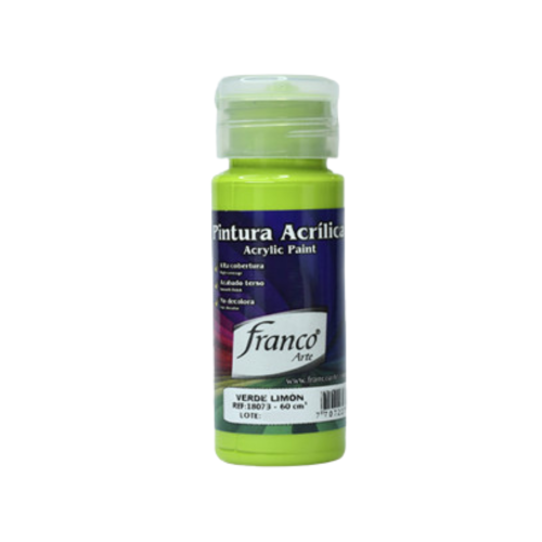 La Pintura Acrílica Franco Arte 60 ml en color Verde Limón es una pintura a base de agua, ideal para decorar, proteger o señalar materiales como madera, MDF, metal, yeso, cerámica, cartón, papel, icopor y paredes interiores. Ofrece un acabado liso y duradero, es no tóxica, lavable, de alto rendimiento, buen cubrimiento, fácil aplicación, excelente adherencia y resistencia a la abrasión.