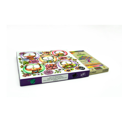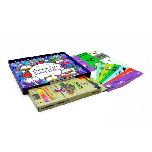 Libro para colorear «Happy Cats Sweet Colors» en kit presentación pasta dura argollado ✍️ Incluye un lindo empaque, separadores de libros y una caja de Colores ecológicos Artisan x 24 con sacapuntas!