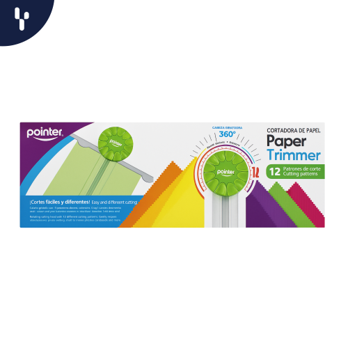 Corta con estilo y precisión con la cortadora de papel Pointer. 12 patrones de corte, cabezal giratorio 360° y diseño portátil ideal para manualidades y uso escolar
